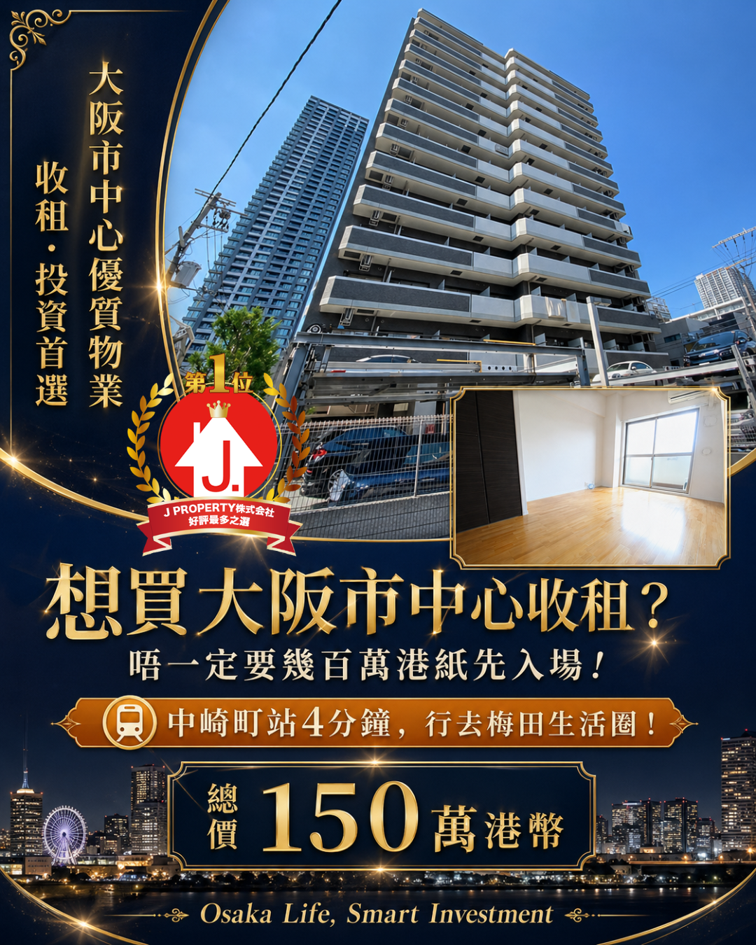 【好評最多的日本物業公司】 大阪「難波」站(可貸款) 最市中心地段無可挑剔位置,2012年樓高層,連租約全包港幣$182萬