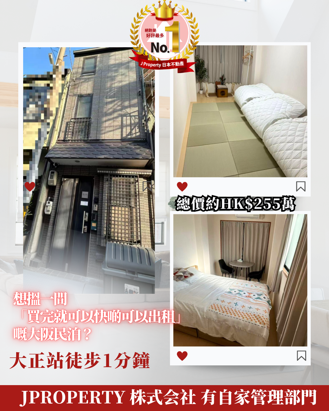【大阪|站1分鐘|4層一棟民泊】,想搵一間「買完就可以快啲可以出租」嘅大阪民泊?呢間大正站徒步1分鐘,4DK可住最多10人,消防已做、全室翻新完成