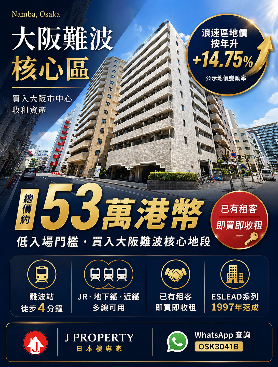【難波收租盤】【Whatsapp我拎回報表啦】 大阪(難波站步行4分鐘) 位置絕佳,名建築商精心建設,97年落成 總價只需53 萬港幣,即買即收租