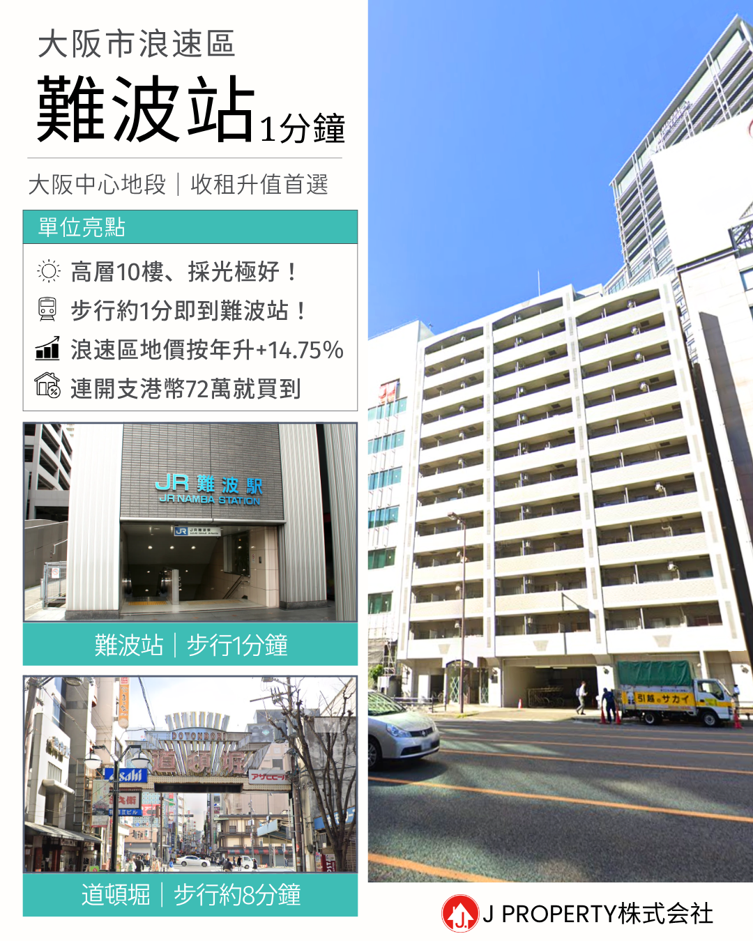 【好評最多的日本物業公司】 大阪「難波」站 ,對面大廈,最市中心地段無可挑剔位置 ,中層收租單位,全包港幣72萬咋