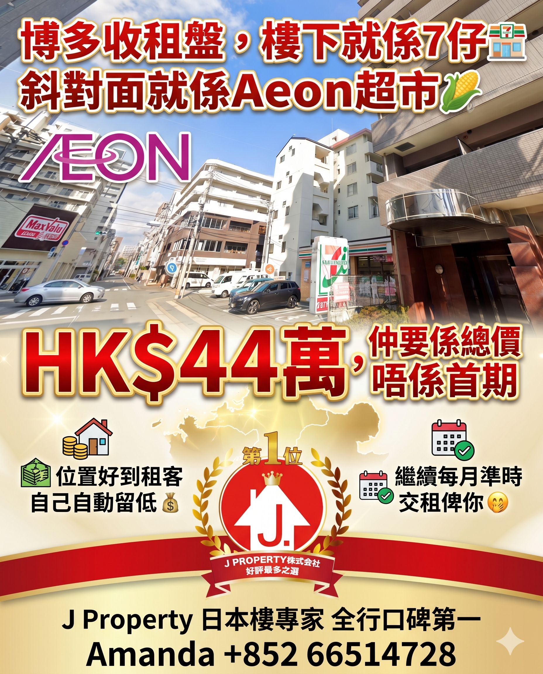 博多收租盤,樓下就係7仔,斜對面就係Aeon超市, 位置好到租客自己自動留低, 繼續每月準時交租俾你