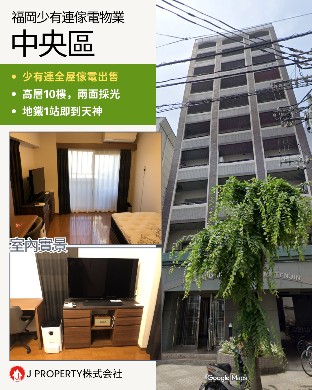 【J Property獲最多人稱老實的日本房產】 福岡中央區,少有連全屋傢電單位,高層10樓單邊,一站到「天神」 總價41萬港幣即收租