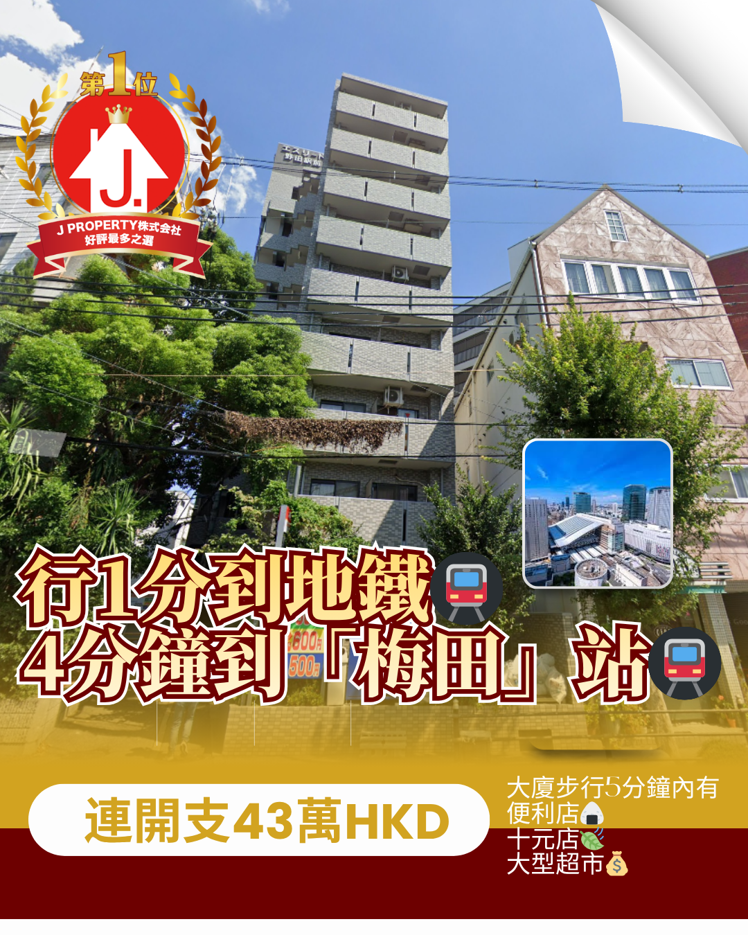 J Property只推薦有「保證人」或「保證會社」的租客, 大阪,行1分到地鐵,4分鐘到「梅田」站, 連開支43萬HKD投資收租首選