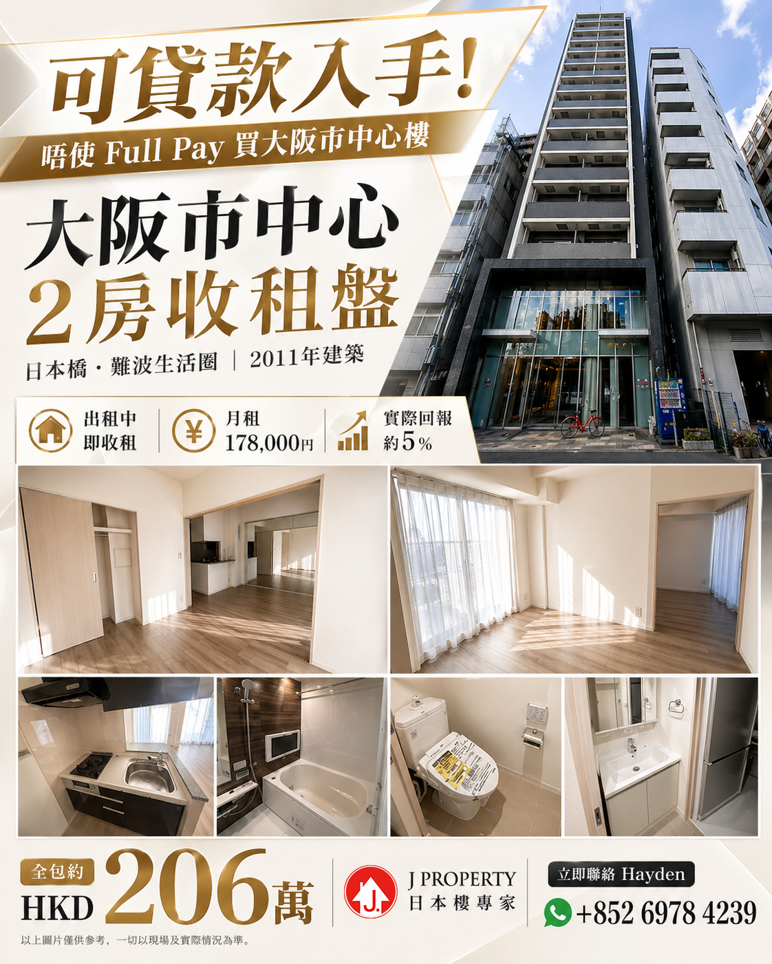 【可貸款】【大阪2房單位 】 大阪日本橋,2011年落成, 連租約,新入住年輕租客,有保證公司, 總價$153萬港幣即#收租,實際回報5%