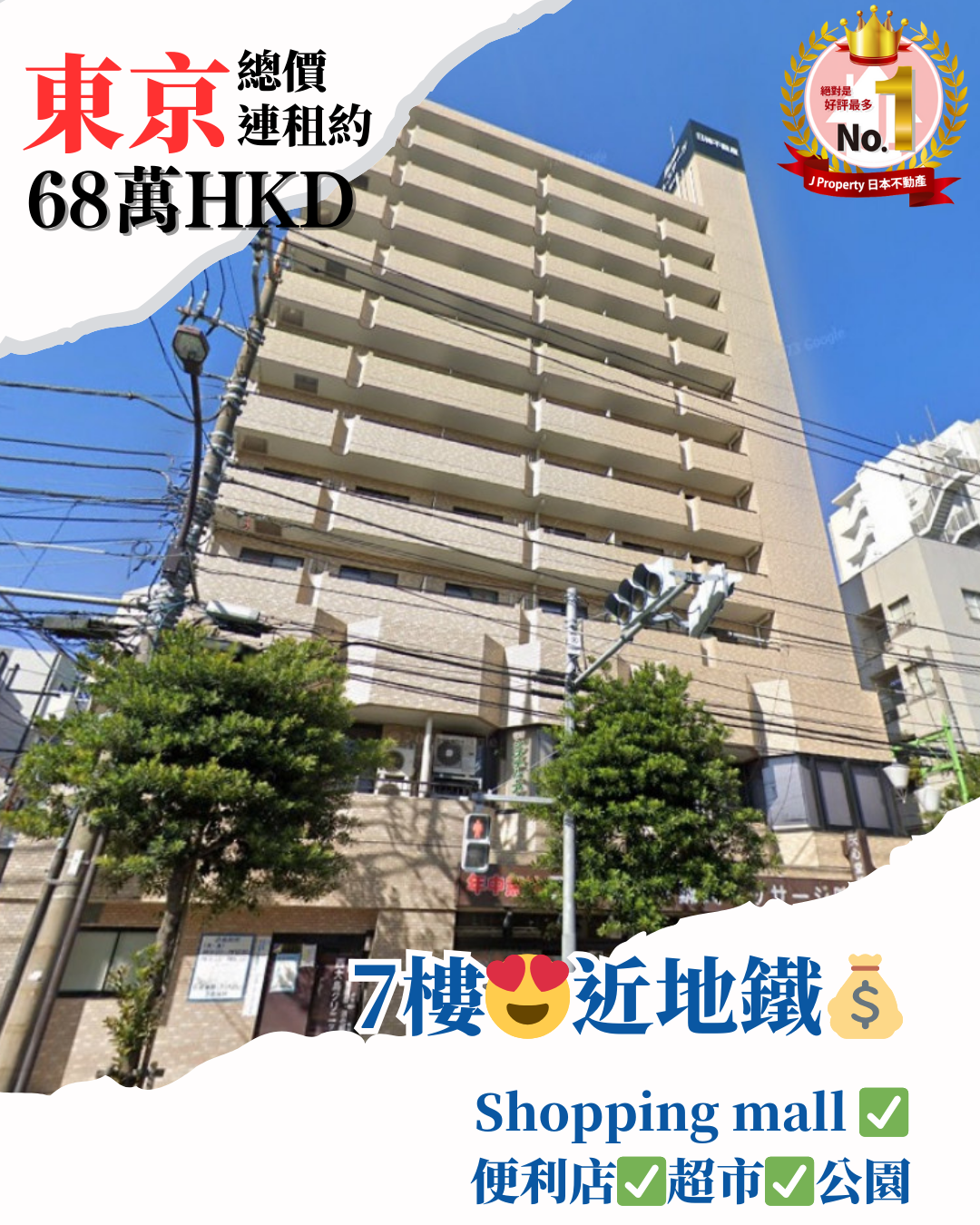 東京行3分鐘地鐵站,7樓出租中單位 ,總價68萬港幣即收租, Shopping mall ,便利店,超市,公園