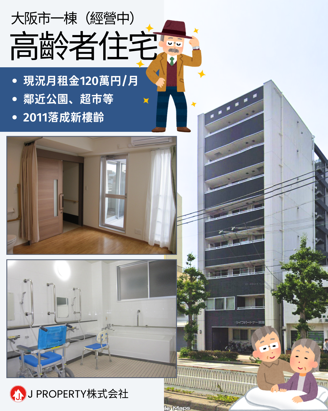 【大阪一棟收租】【銀髮族經濟】 一棟高齡者住宅,鄰近公園、超級市場, 弁天町站交通便利,2011年新耐震|現況滿室,每月租金120萬円