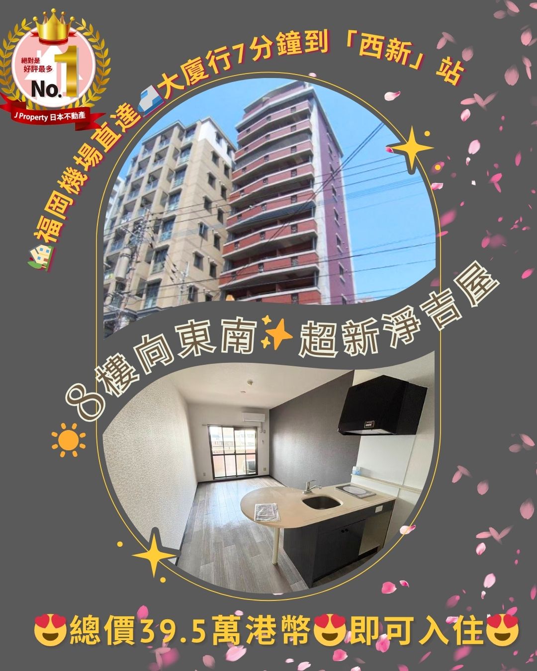 【你知道福岡最多年輕企業家的城市嗎】 福岡機場直達,大廈行7分鐘到「西新」站 ,8樓向東南,超新淨吉屋單位 ,總價39.5萬港幣,即可入住