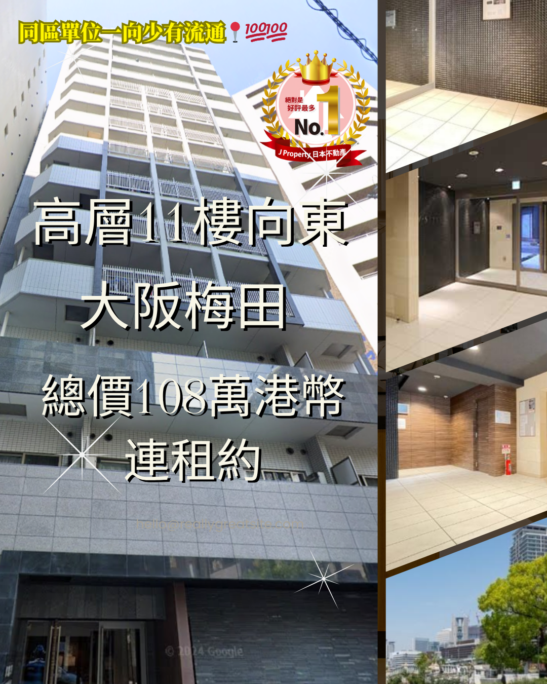 【梅田猶如香港銅鑼灣地段】 ,大阪梅田(行10分鐘)高層11樓向東, 黃金地段,少有流通 ,總價108萬港幣連租約即收租