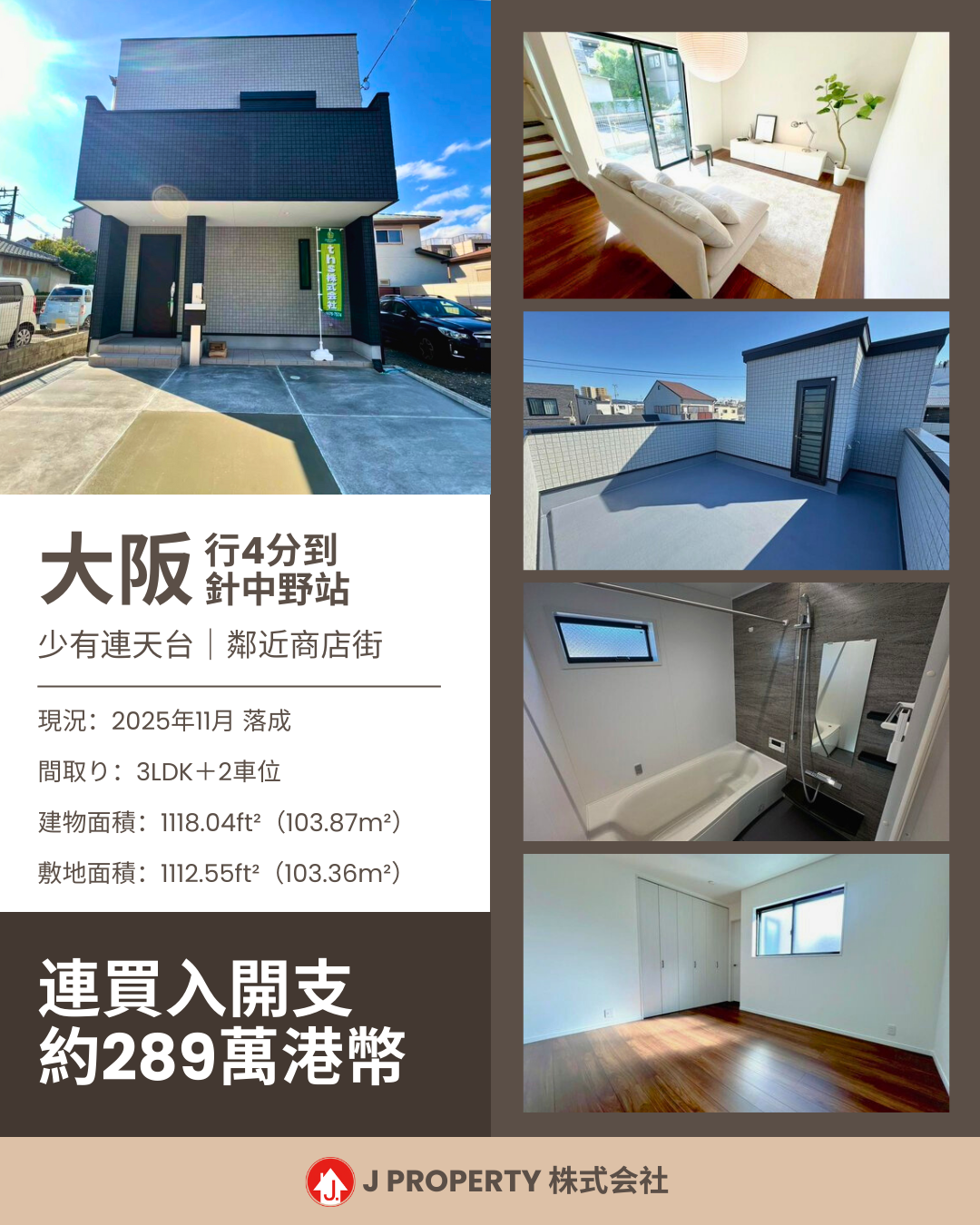 【大阪市自住優質盤】大阪新落成獨立屋 商店街附近 3LDK+2車位 過千呎面積 優質間隔兩廁+天台 永久業權 附近便利店/藥妝店/超市/公園 總價約289萬港幣咋