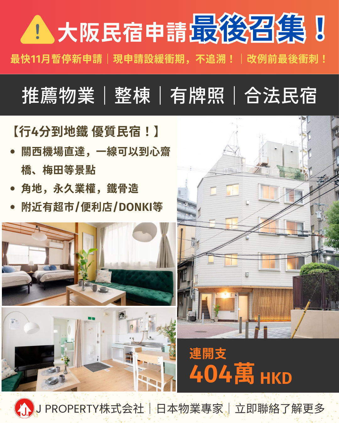 【大阪合法民泊整棟】 特區民泊許可|步行4分鐘到,地鐵站 ,地點超方便,難波、心齋橋、關西機場直達,4層鋼骨建築|土地權利:永久所有權,買入即擁有 【限時搶購|一戶即賣斷】錯過就沒有了!