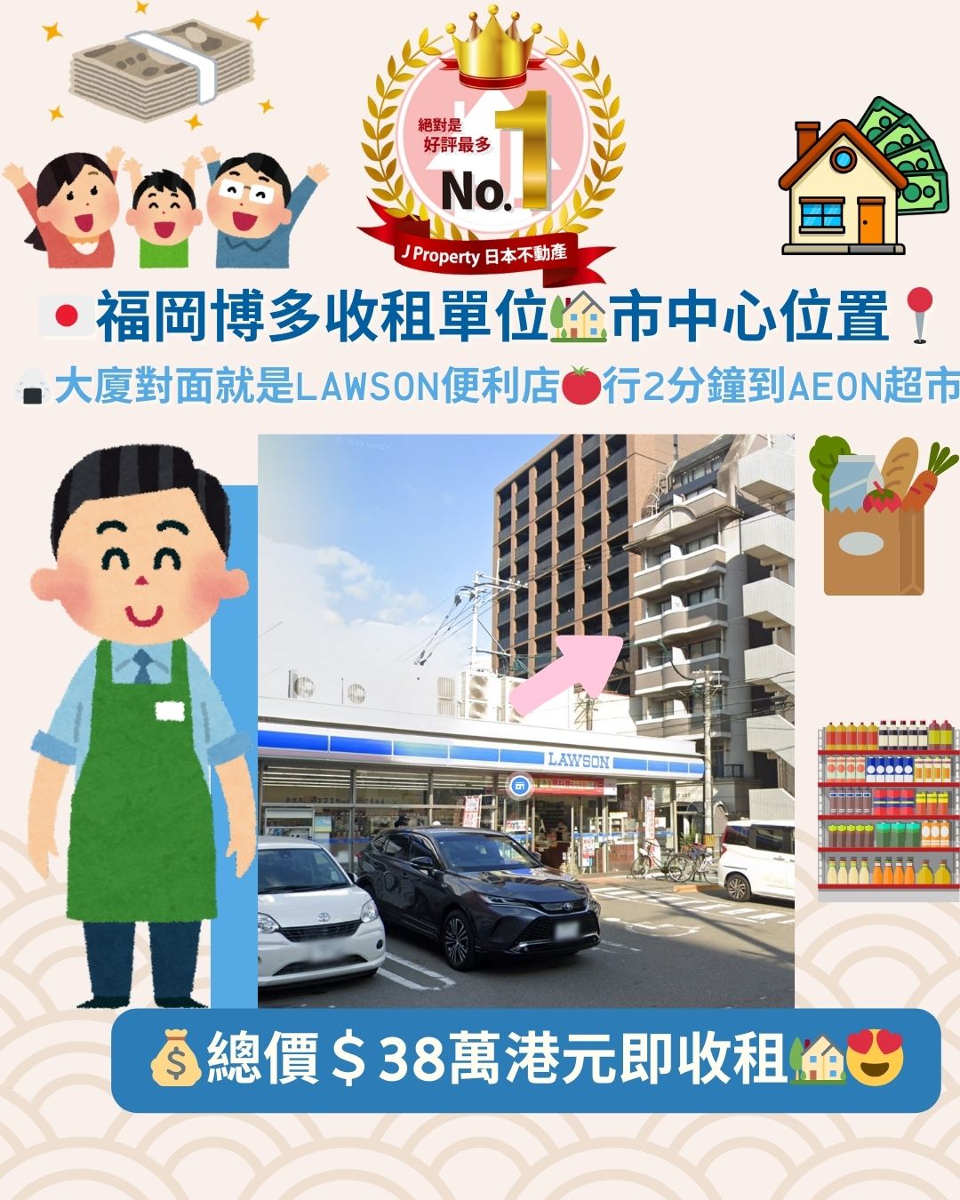 【福岡博多收租單位,市中心位置】 大廈對面就是Lawson便利店,行2分鐘到Aeon超市 ,連租約總價$38萬港幣, 即收租