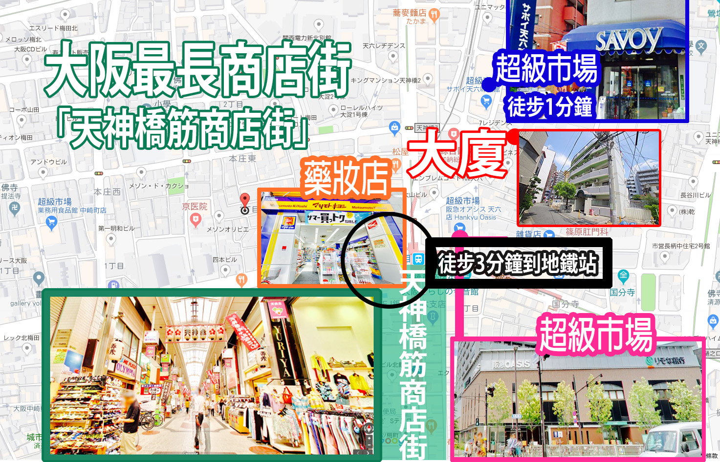 - 站旁是日本最長的商店街「天神橋筋商店街」,店鋪林立,生活便利;