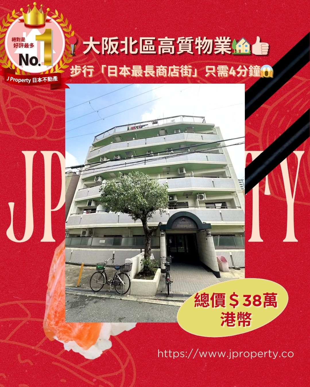 【J Property只推薦「新防震」及「永久產權」物業】 大阪北區高質物業 ,大廈步行「日本最長商店街」只需4分鐘,連租約單位,總價$38萬港幣即收租