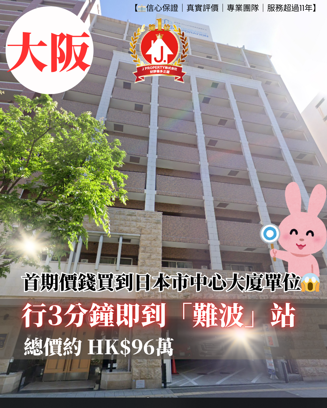 【由日本建築界LV級別,Pressance建造】 大阪中心地帶,步行3分鐘即到「難波」站 ,現成租約在手,月月收租, 總價只需約 HK$96萬,首期價錢買到日本市中心大廈單位