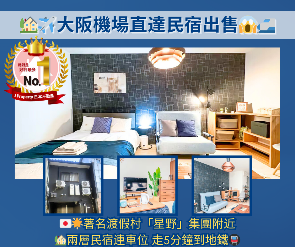 【大阪機場直達民宿出售】 著名渡假村「星野」集團附近 ,兩層民宿連車位,走5分鐘到地鐵,日日出租日日收租