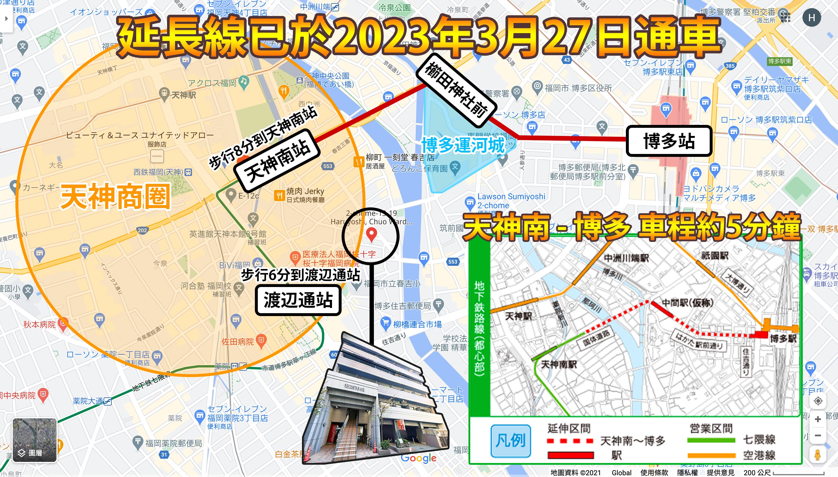 - 七隈線天神南站已經伸延到博多站,地鐵1站到天神南,兩站到博多站,交通更便捷;