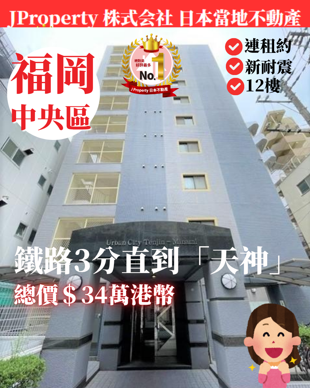 福岡中央區,高層12樓連租約單位,3分直到「天神」總價$34萬港幣即收租