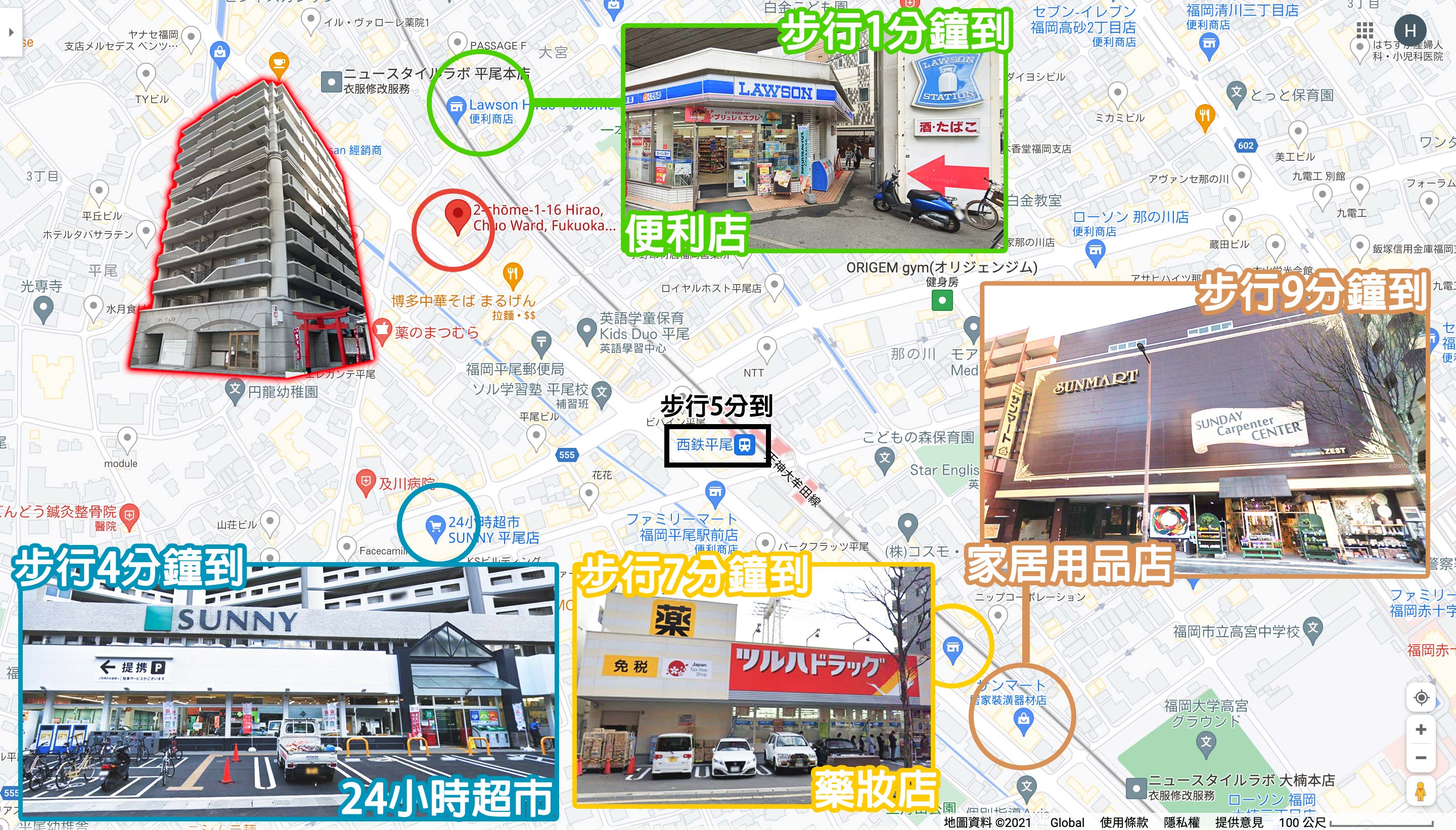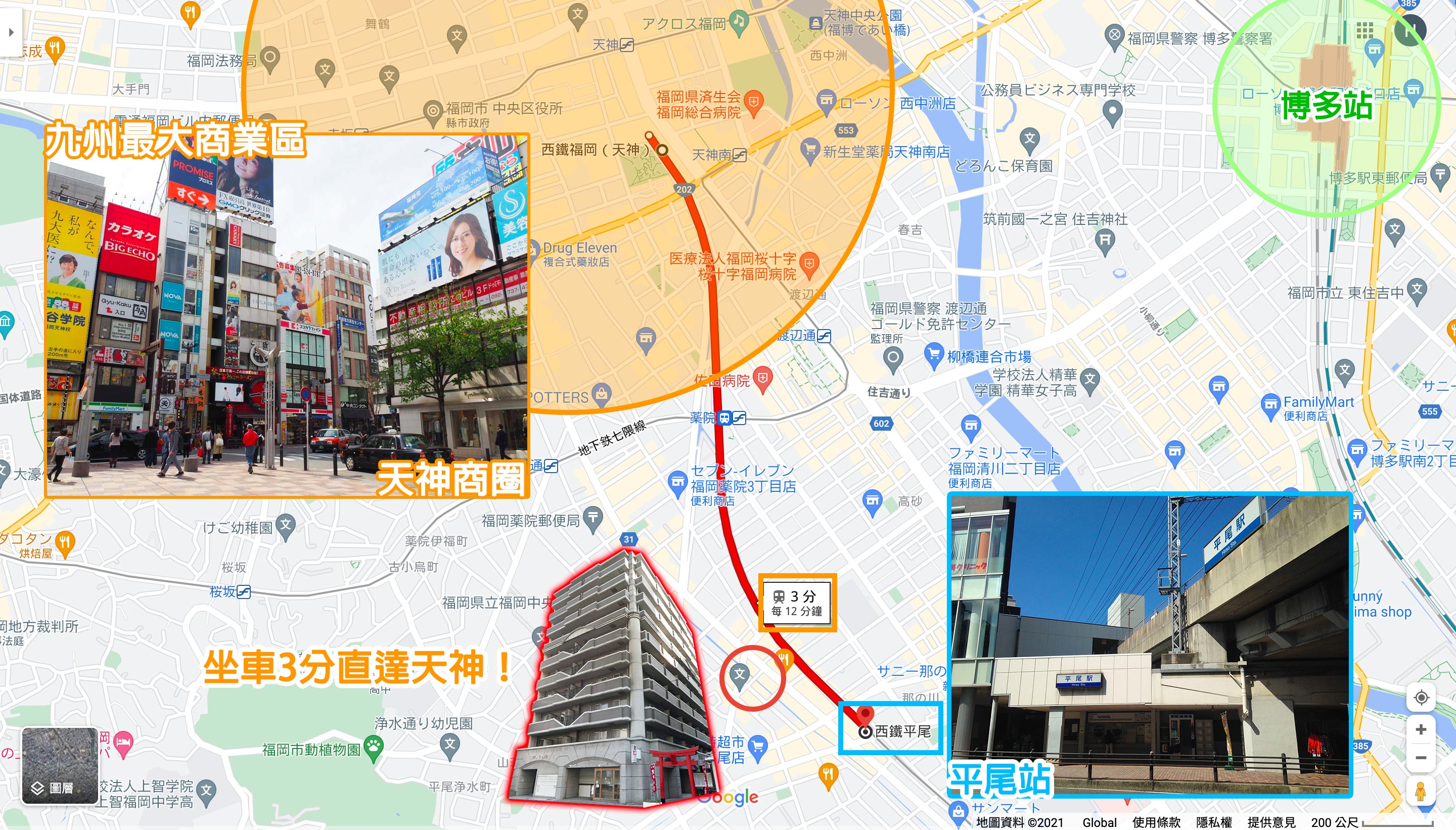 大廈步行5分鐘到「平尾」站,2站到「天神」;