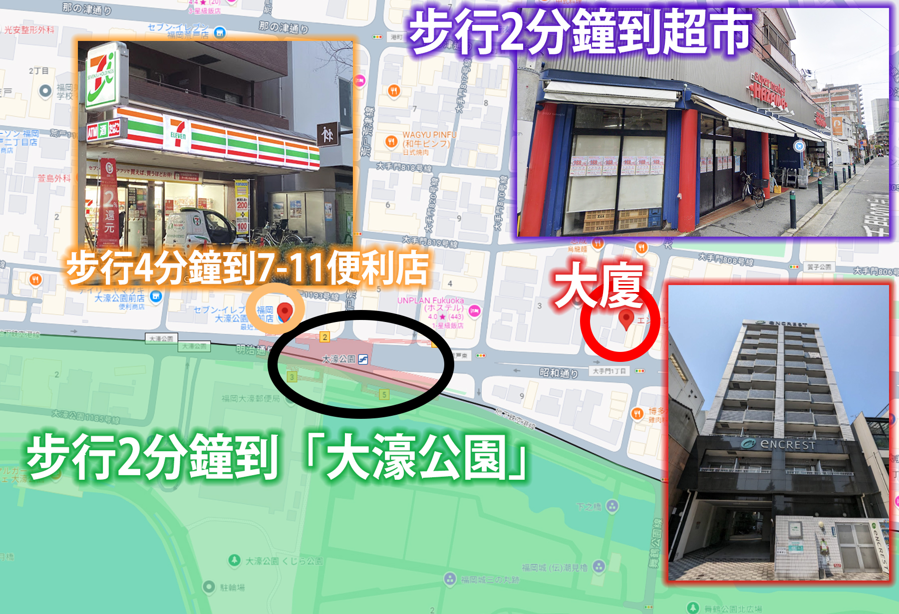 大廈步行2分鐘到「大濠公園」站,2站到「天神」,4站到「博多」,6站到「機場」