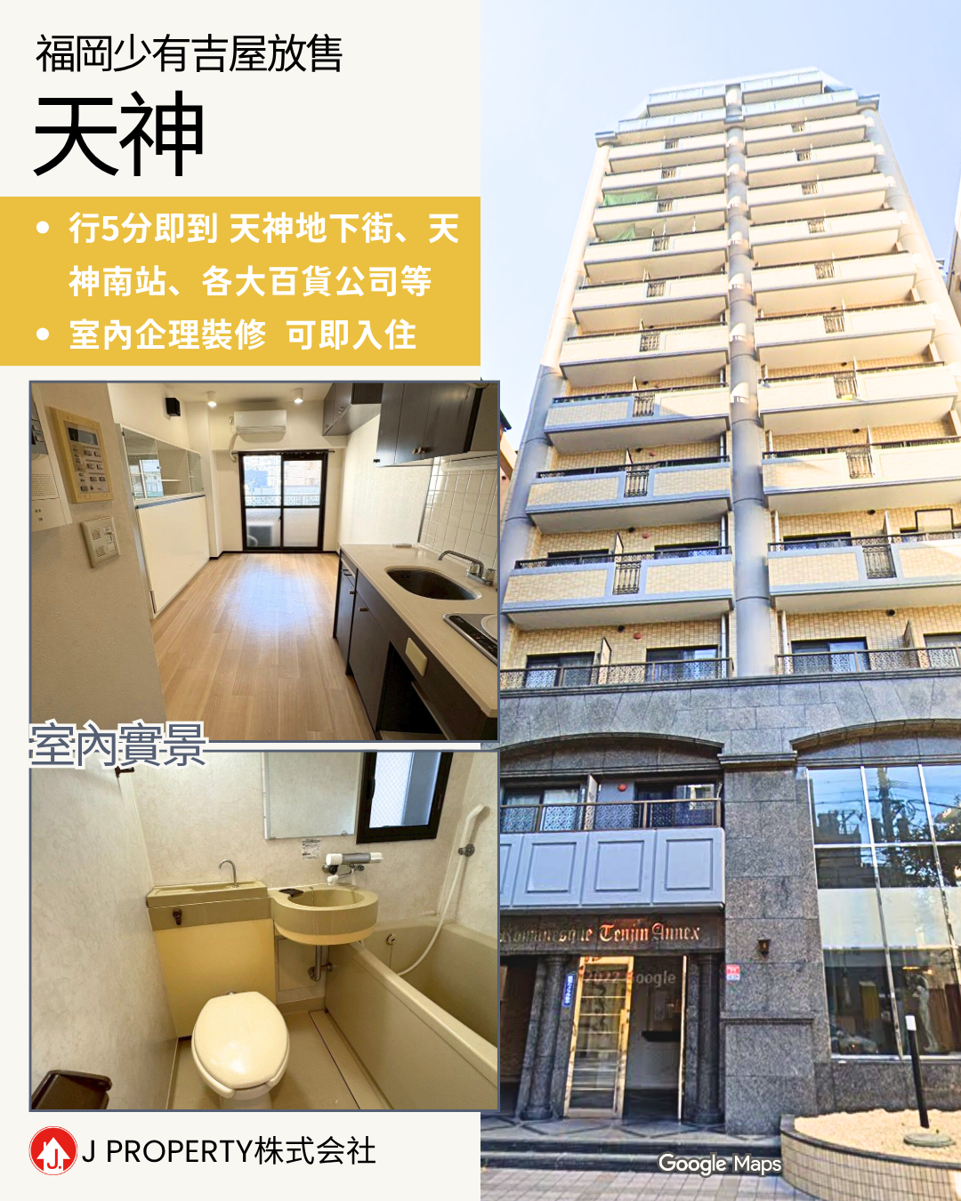 【福岡天神少有吉屋】【Whatsapp我拎室內相啦】 福岡九州最強商業區,中央區—天神,大廈步行5分鐘到「天神」站和天神商圏 企理裝修,即可入住,總價$40萬HKD