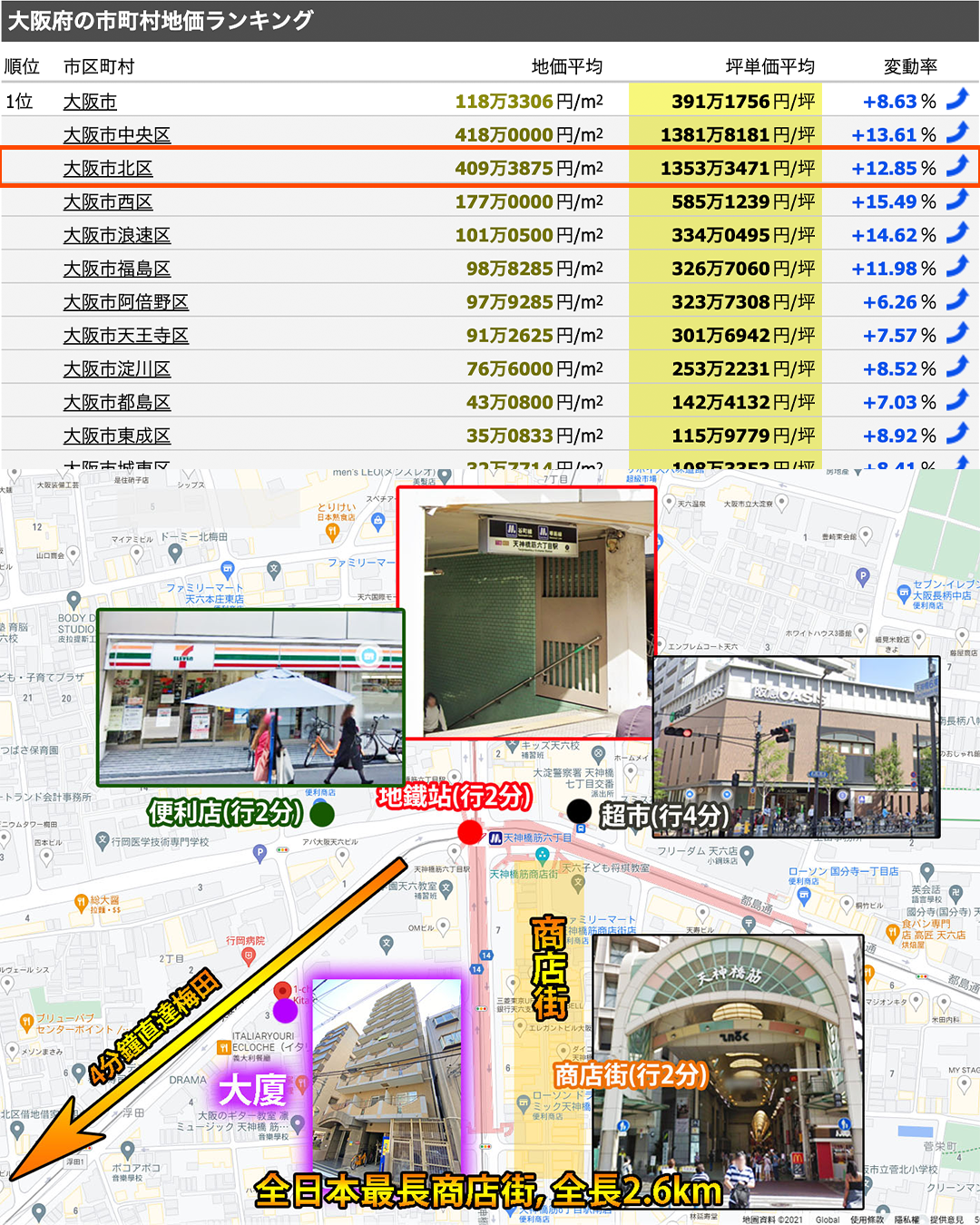 步行2分鐘已到日本最長商店街「天神橋筋商店街」沿途可以看到餐廳、超市、服飾店、蔬果店、電影院、整骨院、藥妝店、書店、理髮店、雜貨店、居酒屋…等