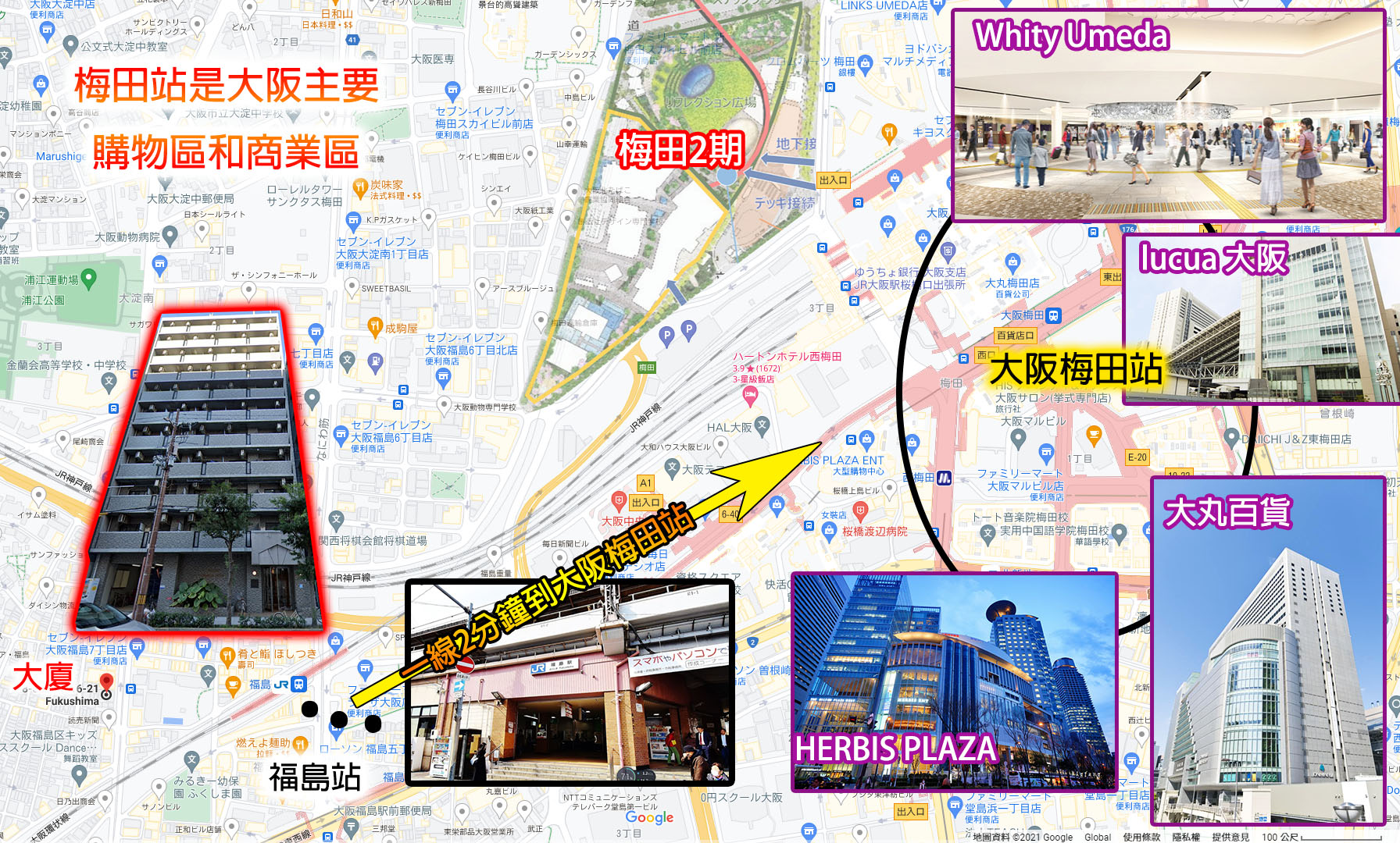 梅田一站圈,叁線交匯:JR/阪神/JR東西線 3 站齊集,福島→大阪/梅田一站到,租客需求長期旺盛