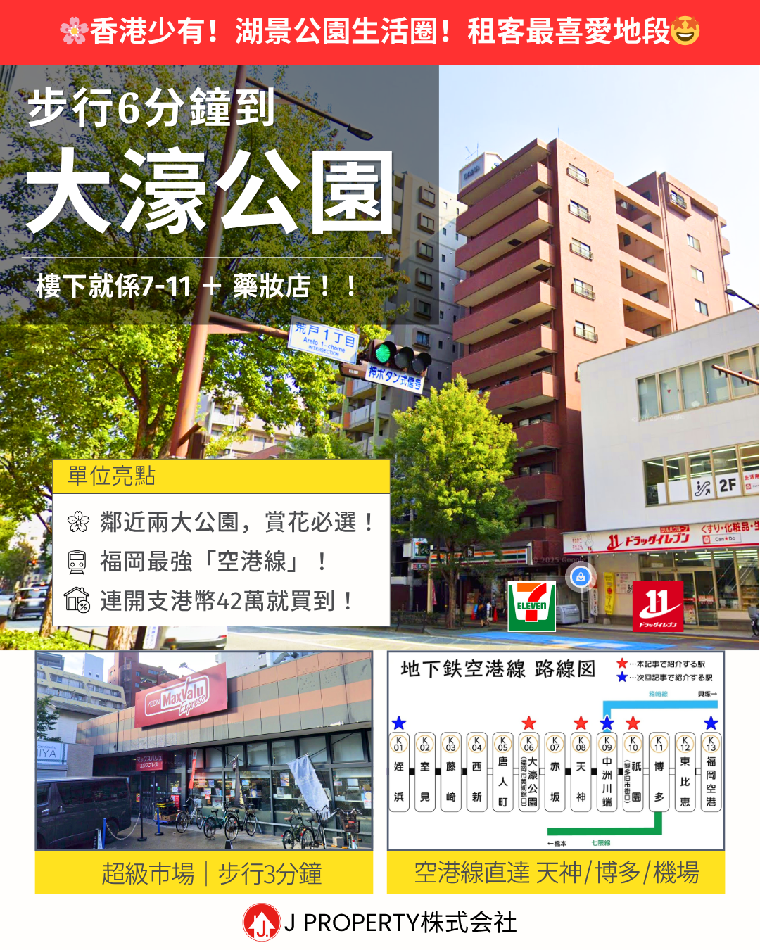 【香港少有!湖景公園生活圈】福岡大濠公園 全包只係42萬(全包價!包樓價、稅金及傭金)! 樓下就係 7-11 便利店同藥妝店,步行 3 分鐘即達超級市場