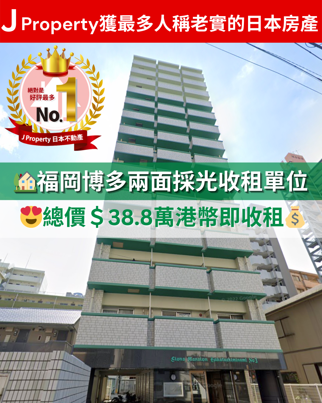【J Property獲最多人稱老實的日本房產】 福岡博多兩面採光,中層5樓收租單位 ,總價$38.8萬港幣即收租