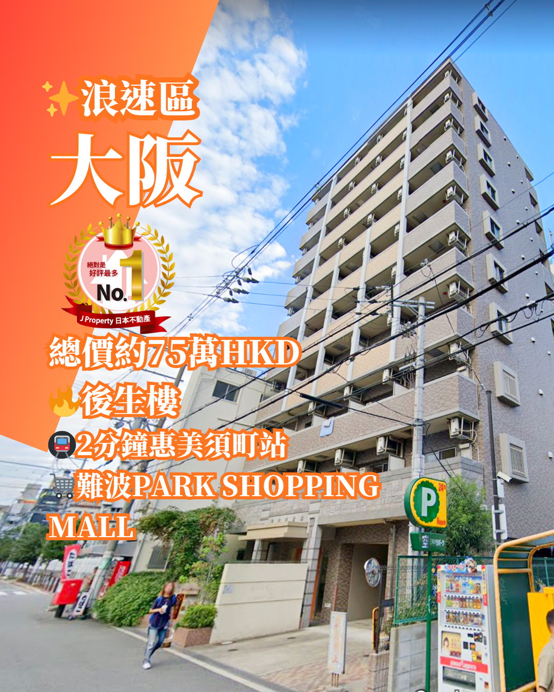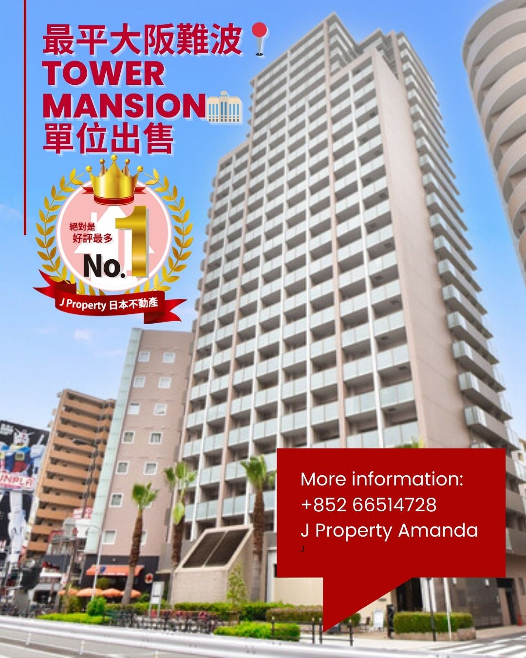 【日本樓Tower Mansion專家】 最平大阪難波,Tower Mansion,單位出售 J日本橋商店,街1分鐘步程 ,雙露台10樓收租單位,總價$139萬港幣咋
