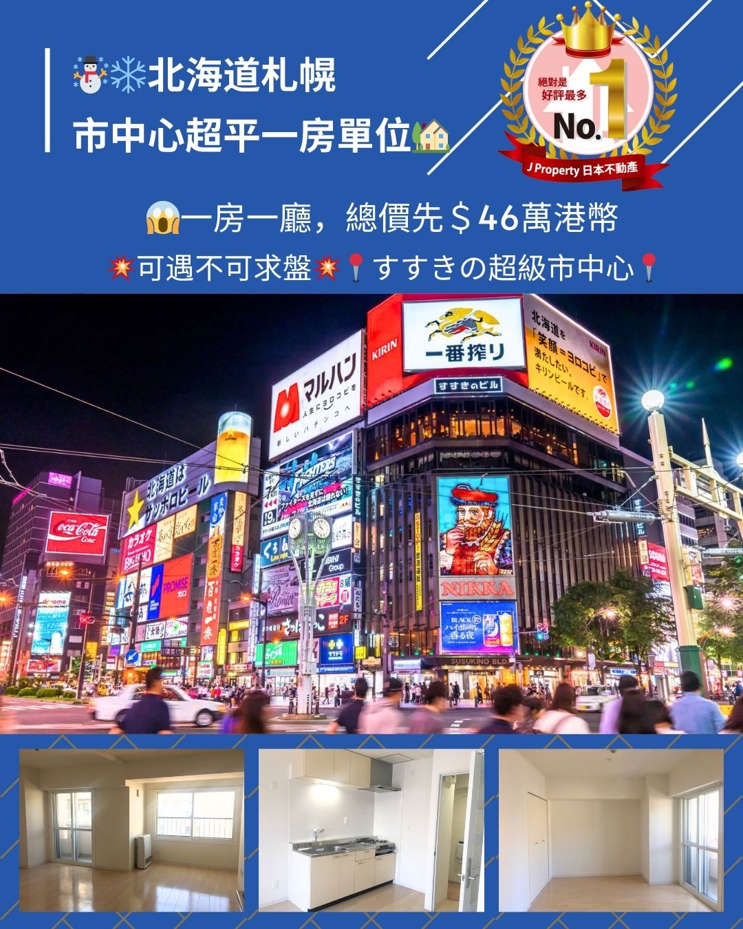 北海道札幌市中心超平一房單位,可遇不可求盤,すすきの超級市中心,走路7分鐘到「狸小路商店街」,可步行連接「薄野站」「大通站」一房一廳,總價先$46萬港幣,癡線架