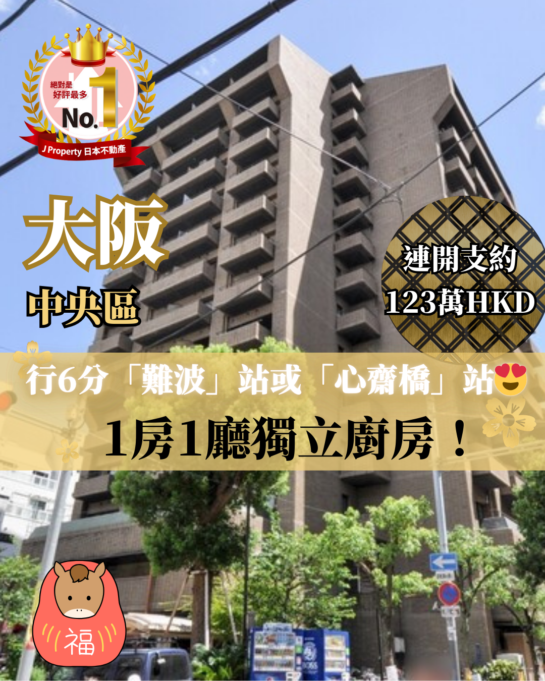 【行6分鐘到心齋橋】大阪中央區!行6分「難波」站或「心齋橋」站 高層12樓 1房1廳獨立廚房! 總價約123萬HKD