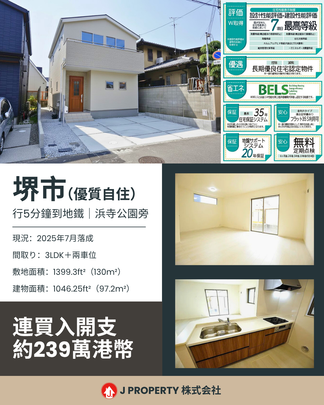 【近期最優質自住一戶建】【WhatsApp我拎更多資料啦】 超大綜合公園旁,3LDK極好間隔+雙車位 ,步行5分鐘到地鐵站, 難波/機場一線直達 ,總價僅239萬港幣,優質建商信心保證