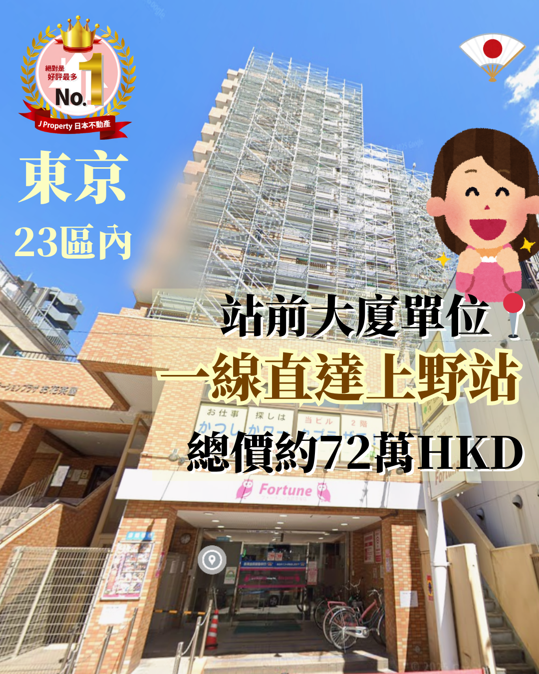 J Property是業界少數擁有自家物業管理公司的企業, 東京23區,站前大廈單位,一線直達上野站 ,總價約港幣72萬