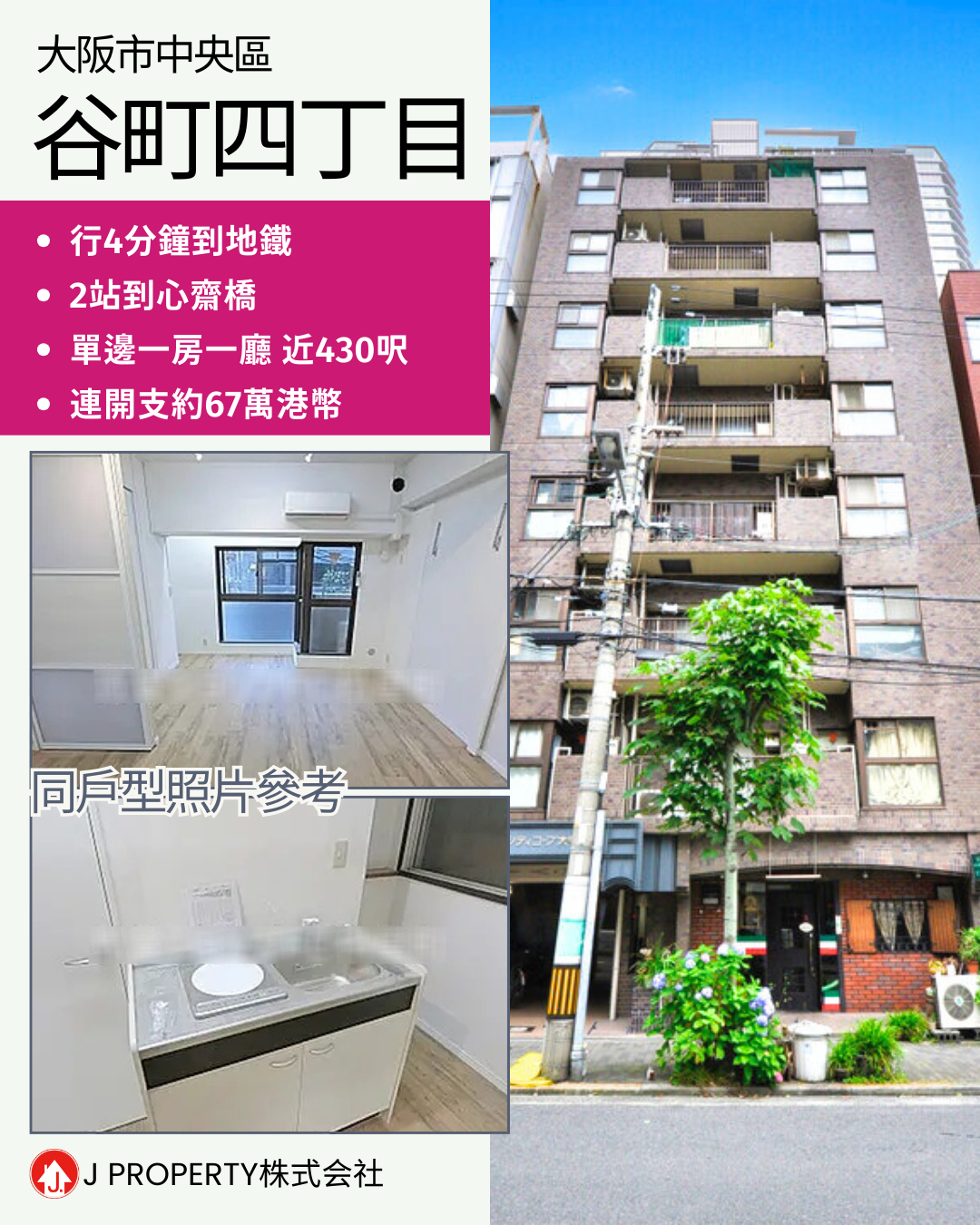 【大阪核心商務區】【WhatsApp我拎回報表啦】 大阪中央區1房1廳、實用面積430呎 ,大廈2站直達心齋橋,行4分鐘地鐵站 ,連開支67萬港幣即收租