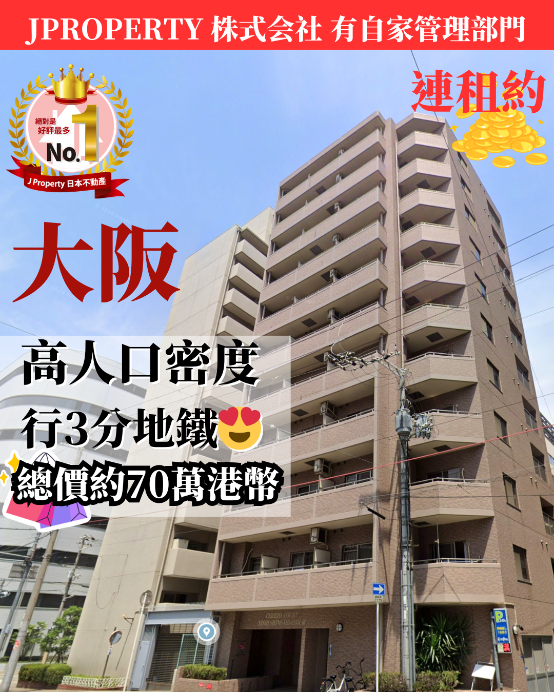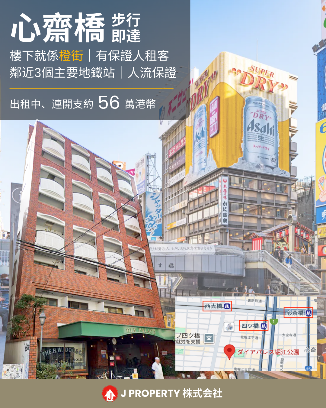「J Property 自設管理部,係你投資日本最佳夥伴」 步行即達心齋橋,樓下就係橙街, 有保證人租客,約售總價$56萬HKD即收租 【大阪西區地價較去年上升 15.49%】