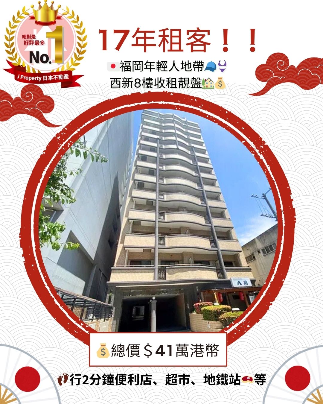 【17年租客】 福岡年輕人地帶,西新8樓收租靚盤,行2分鐘便利店、超市、地鐵站,等 ,一線直達天神、博多、機場 ,總價$41萬港幣即收租