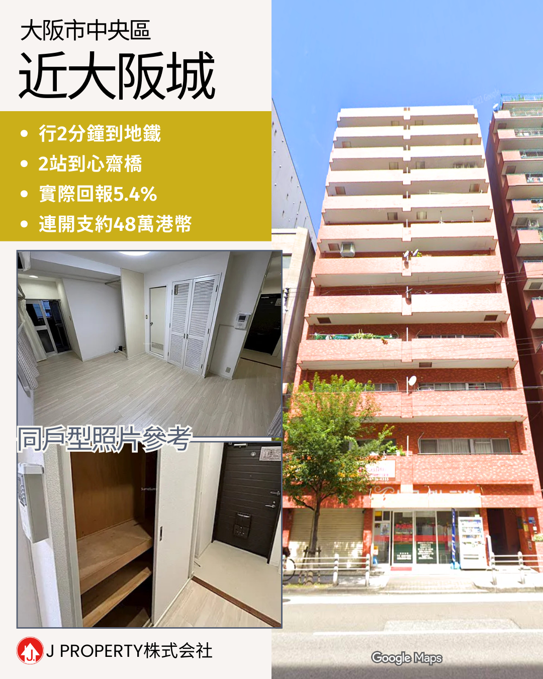 【大阪核心商務區】【WhatsApp我拎回報表啦】 大阪中央區 總價$48萬HKD就買到 大廈2站直達心齋橋,行2分鐘地鐵站 連租約,即買即收租單位