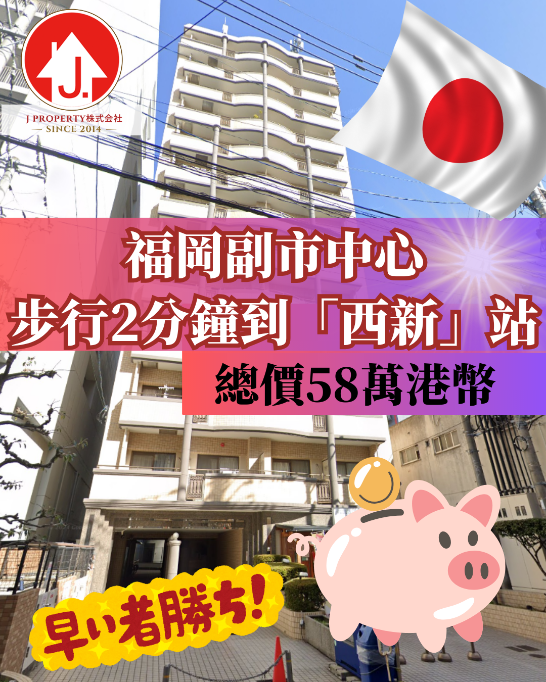 【空港線近站物業】【單邊高層】 福岡,行2分鐘便利店、超市、地鐵站等 ,一線直達天神、博多、機場,連租約總價58萬港幣