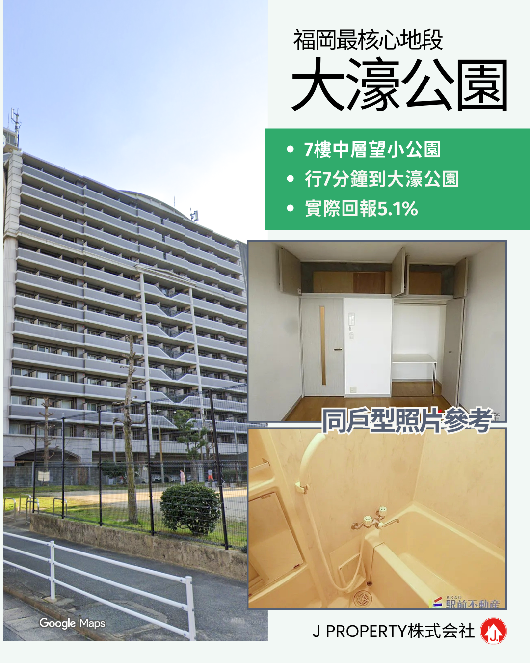 【福岡超熱門,大濠公園吉屋】 福岡大濠公園,單邊、兩面採光,靚間隔浴室、廁所有窗,總價港幣$50萬