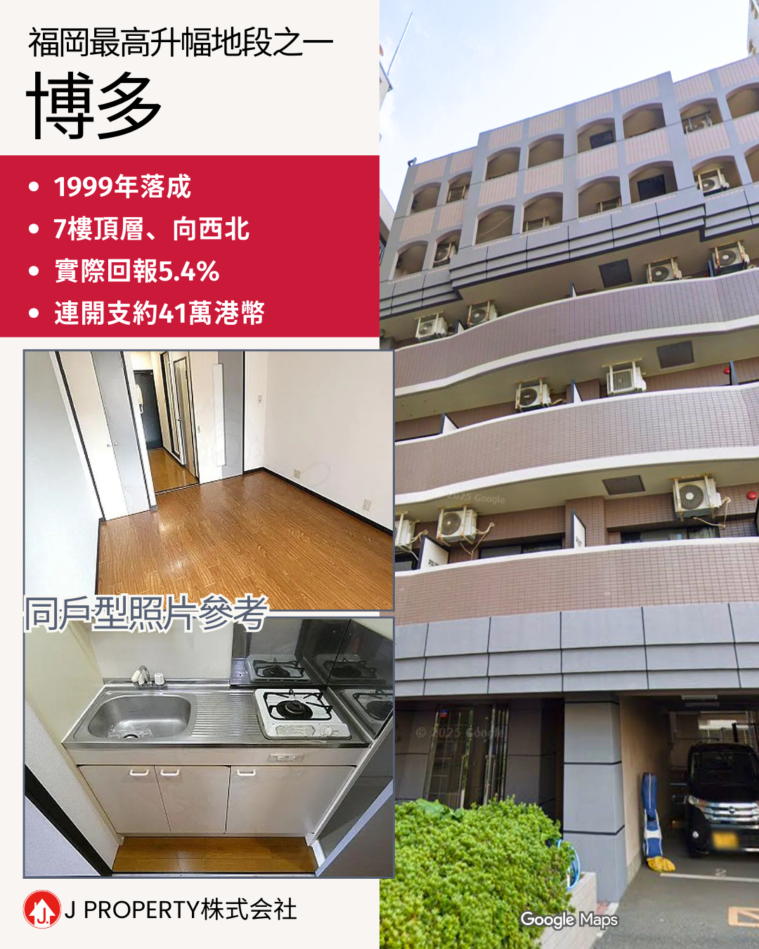 【福岡最高升幅地段之一】 福岡高回報收租盤,行5分到地鐵站,兩站到天神,總價$54萬港幣即收租