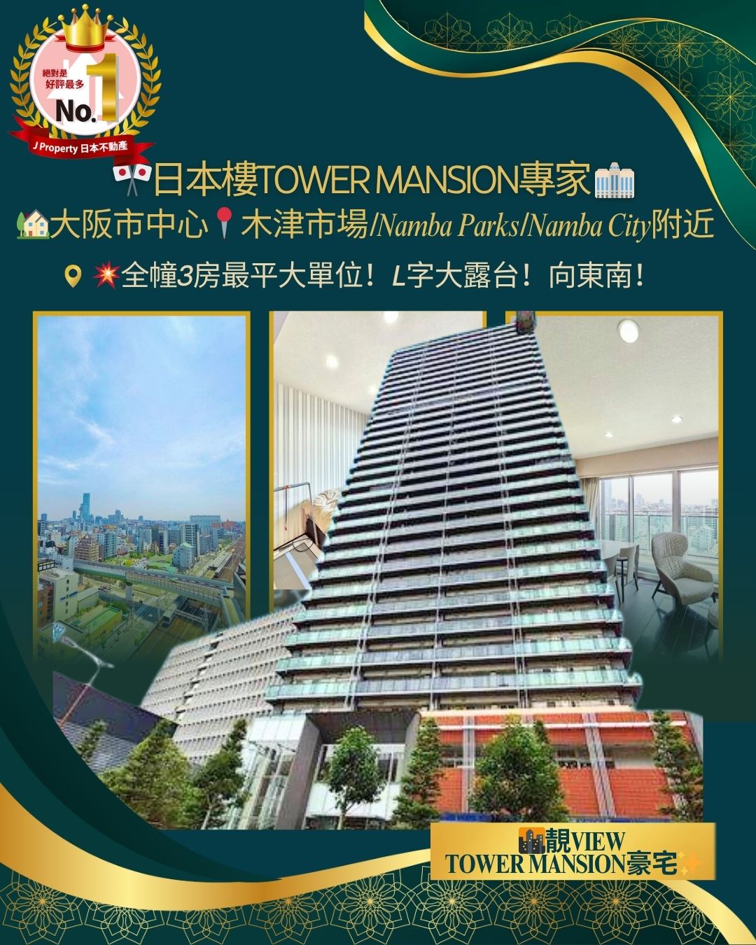 【日本樓Tower Mansion專家】 全幢3房最平大單位,L字大露台,向東南,大阪市中心靚View Tower Mansion豪宅,木津市場,附近Namba Parks,Namba City,一路連住高島屋及難波站,地段一流