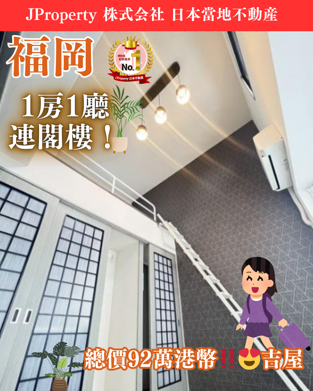 福岡1房1廳連閣樓!高樓底, 低管修費,高層電梯樓,3站到天神(超強商業區) 有站前商店街,總價92萬港幣,吉屋