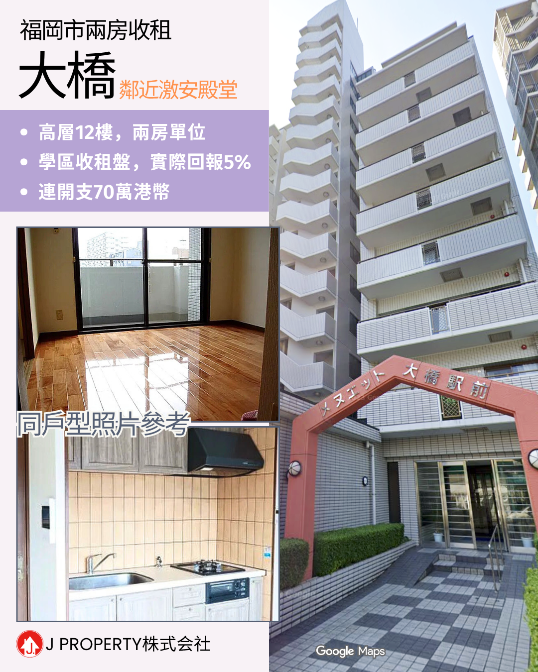 【買大學附近收租你最醒】 福岡,步行6分鐘內有Donki、超市、便利店、商店街 「九州大學 大橋」大橋站高人流,商業價值極高,總價$70萬港幣,兩房高樓層