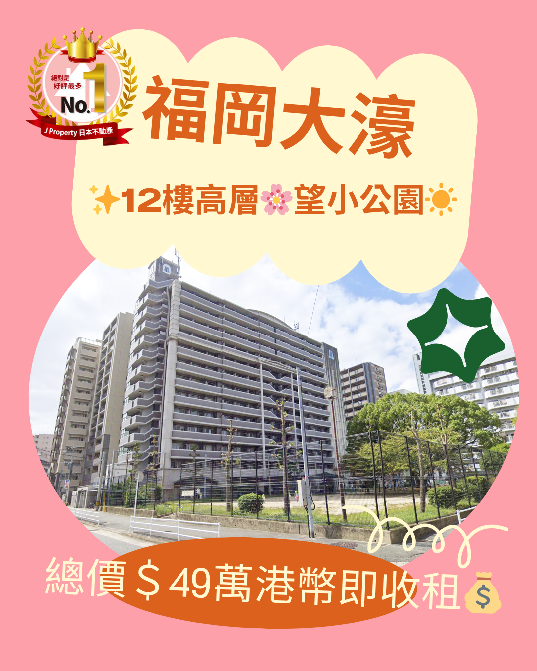 【福岡大濠公園荀盤】 12樓高層,望小公園,實際回報5.4%,總價$49萬港幣即收租