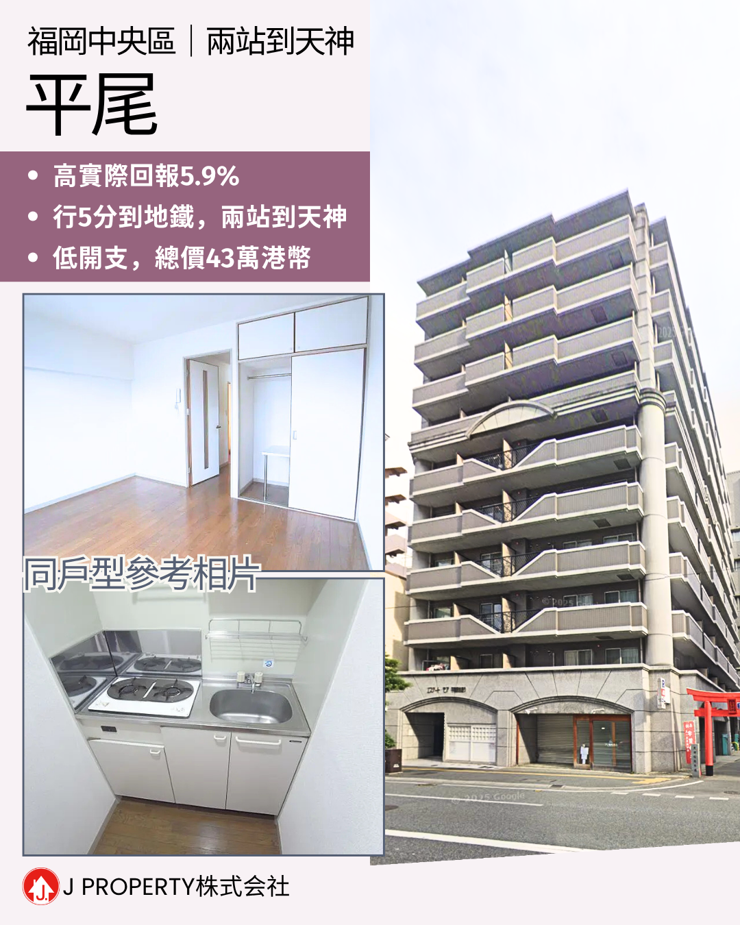 【福岡優質間隔盤】【WhatsApp我拎回報表啦】 最多人考慮租賃的地鐵站頭3名,福岡低管修費,高回報率,少有獨立廚廁 ,2站即到天神,總價港幣$42萬即收租