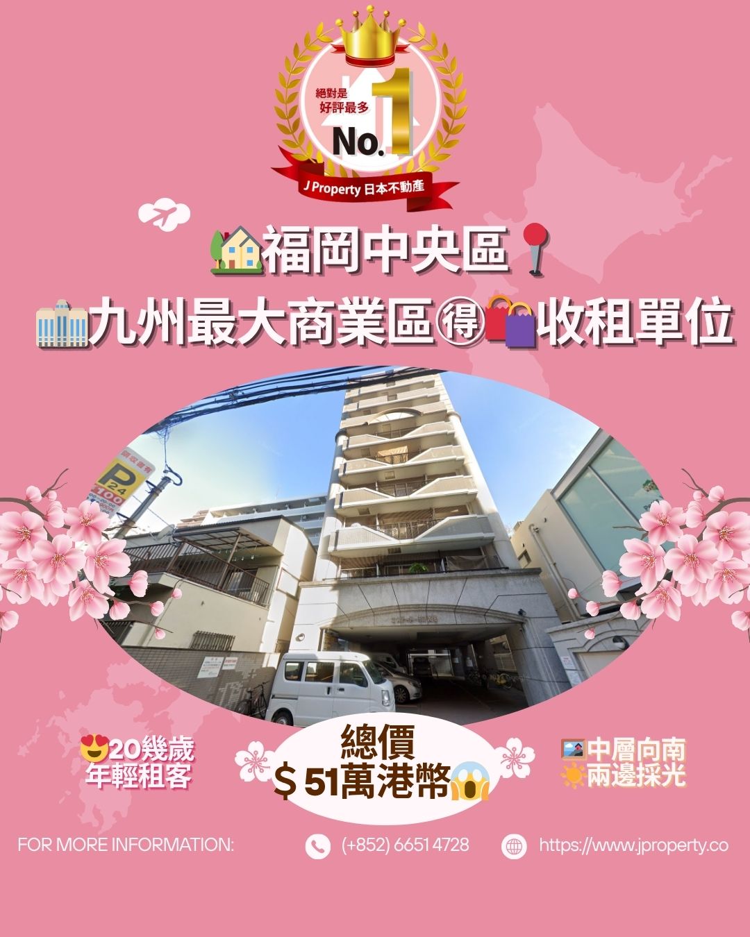 【最低匯率買日本樓你最醒】 福岡中央區,九州最大商業區,收租單位 ,20幾歲年輕租客,中層向南,兩邊採光 ,總價先係$51萬港幣