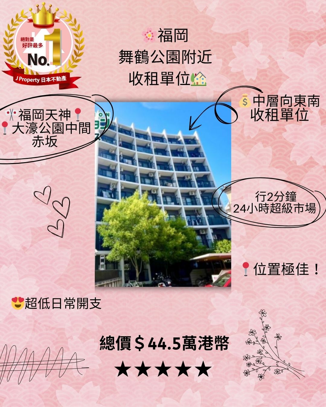 【福岡舞鶴公園附近收租單位】 福岡天神,大濠公園中間赤坂,位置極佳 ,中層向東南收租單位,總價$44.5萬港幣