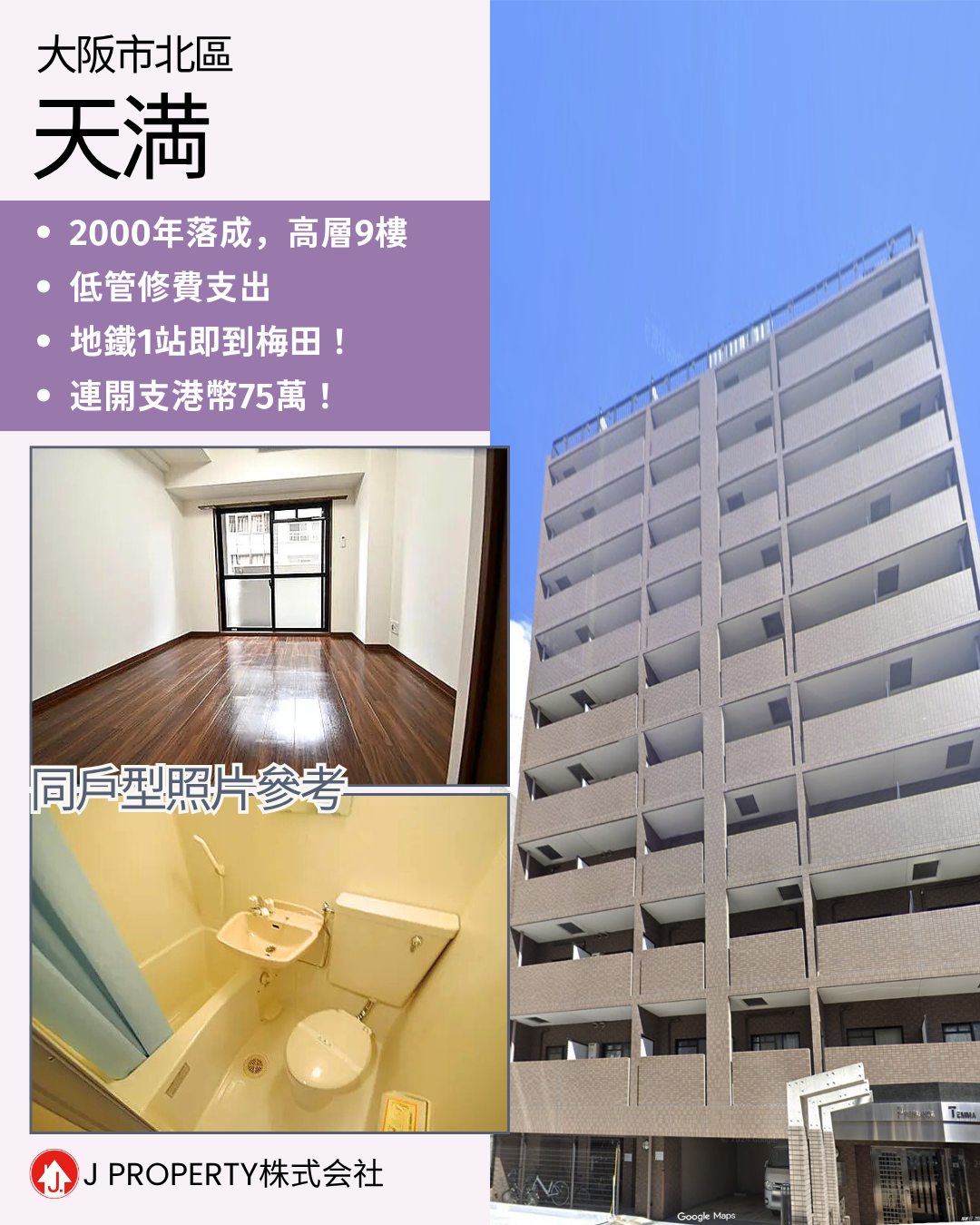 【大阪市北區超值盤】 大阪2000年後,行3分到叁線交匯地鐵站, 行2分鐘到「天神橋筋商店街」高層9樓,總價約75萬港幣
