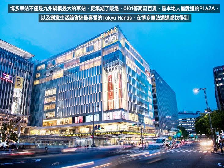 -「博多站」本身更是大型綜合商業區,集結了阪急、0101、KITTE等潮流百貨,超過百間商店,有大人氣的Tokyu Hands等,也有各式餐飲、電影院、空中花園,購物,應有盡有