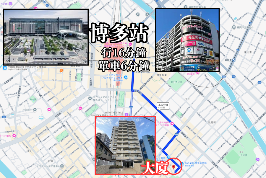 單車6分鐘「博多」站,步行16分鐘到「博多」站,同時連接著大型購物中心,吃喝玩樂無難道‧